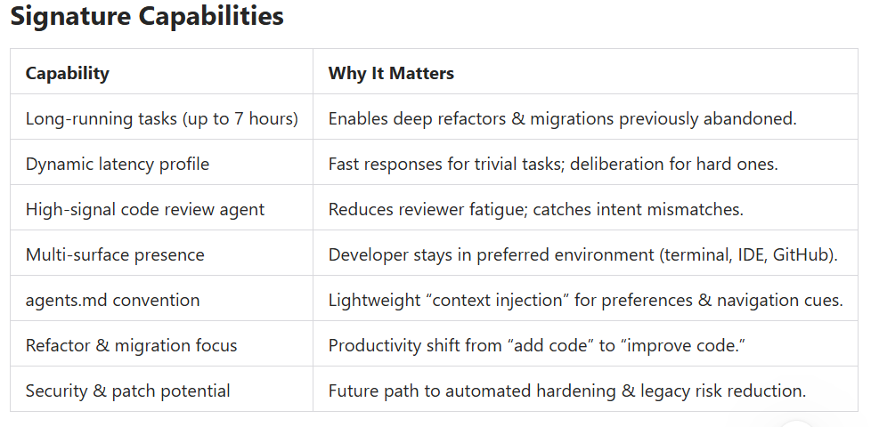 - Persistence + “grit” for multi-hour refactors = new differentiator.