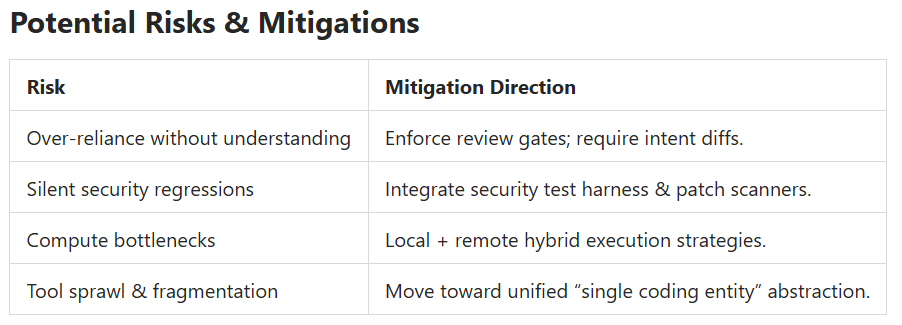- Shift from raw generation to migration, refactor, security patching, large-scale codebase stewardship.