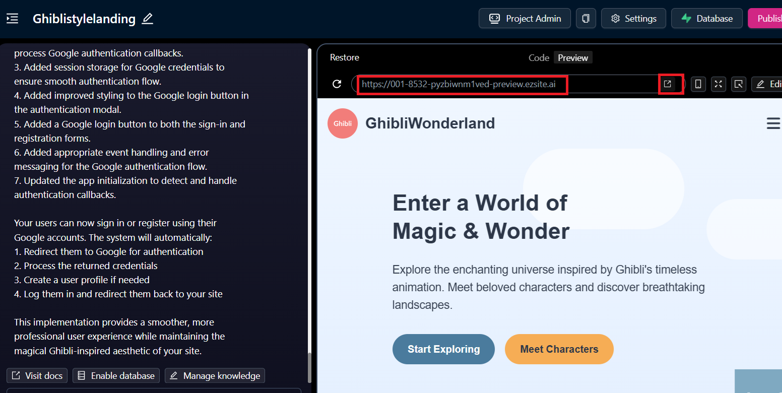 Step 2: To verify the Google login, click the New Window button or copy the preview URL and open it in a separate browser window.