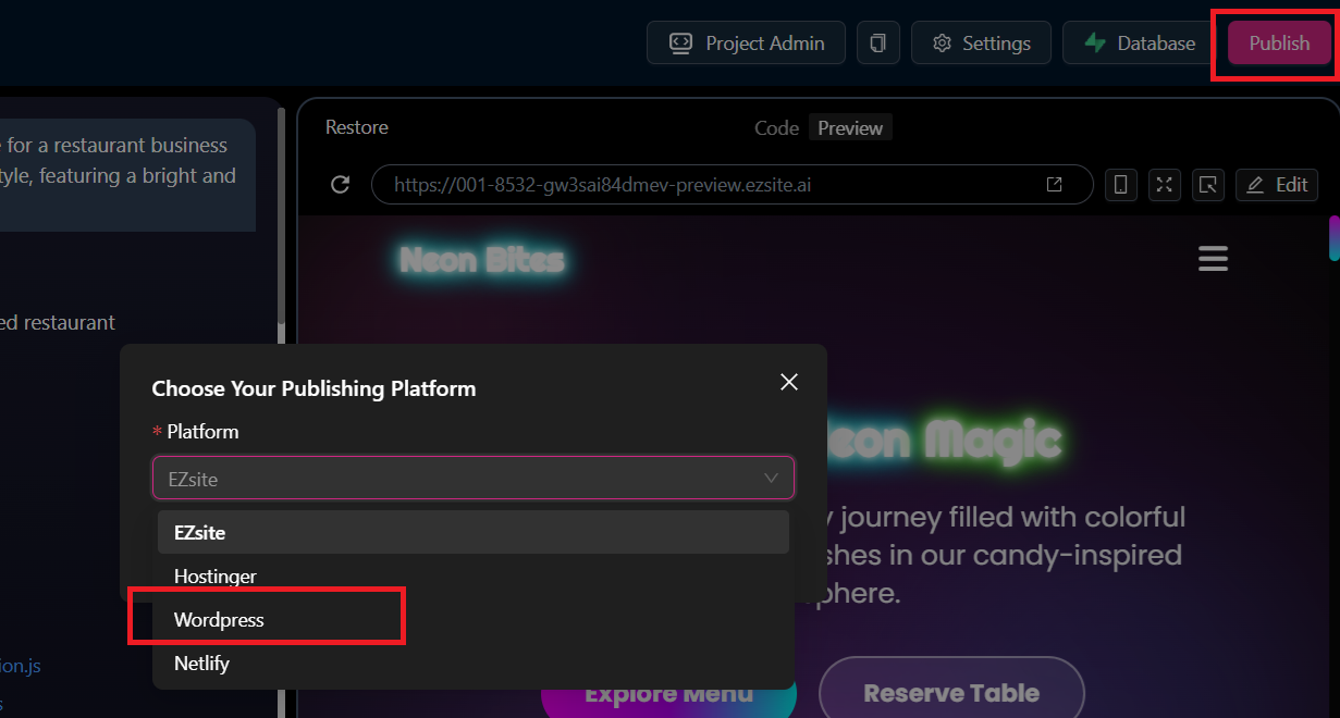 Click the "Publish" button in the top right corner, then select "WordPress" from the dropdown menu in the popup window