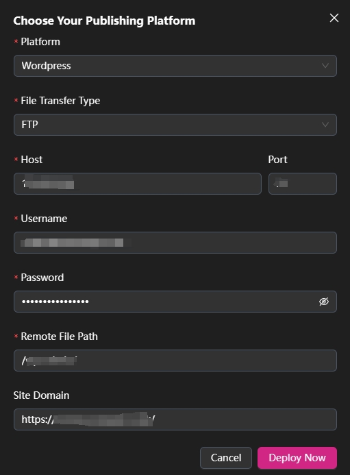 Get your FTP hostname, username, password, and port from your WordPress hosting provider