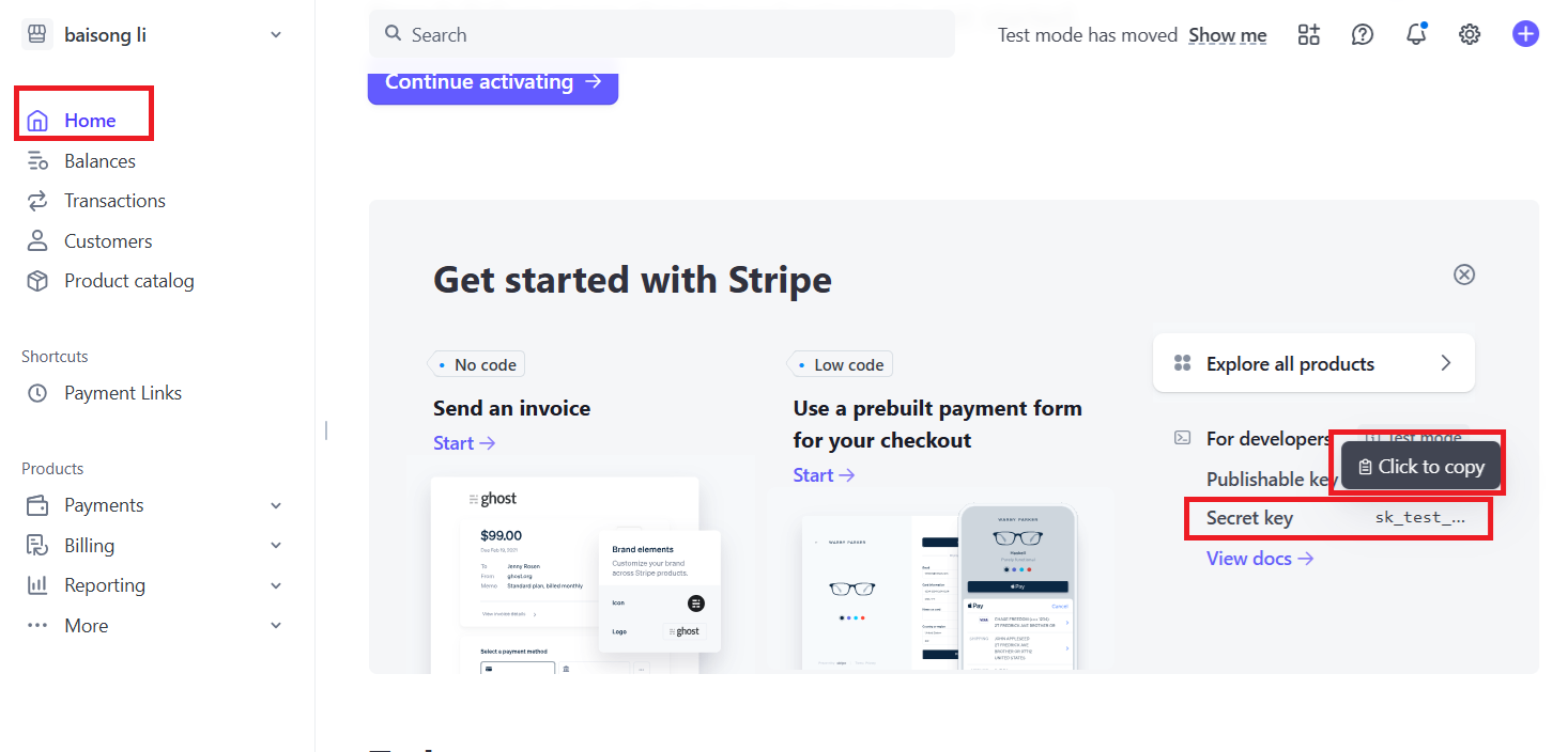 Log in to your Stripe account, locate your Secret Key, and click "Click to Copy".