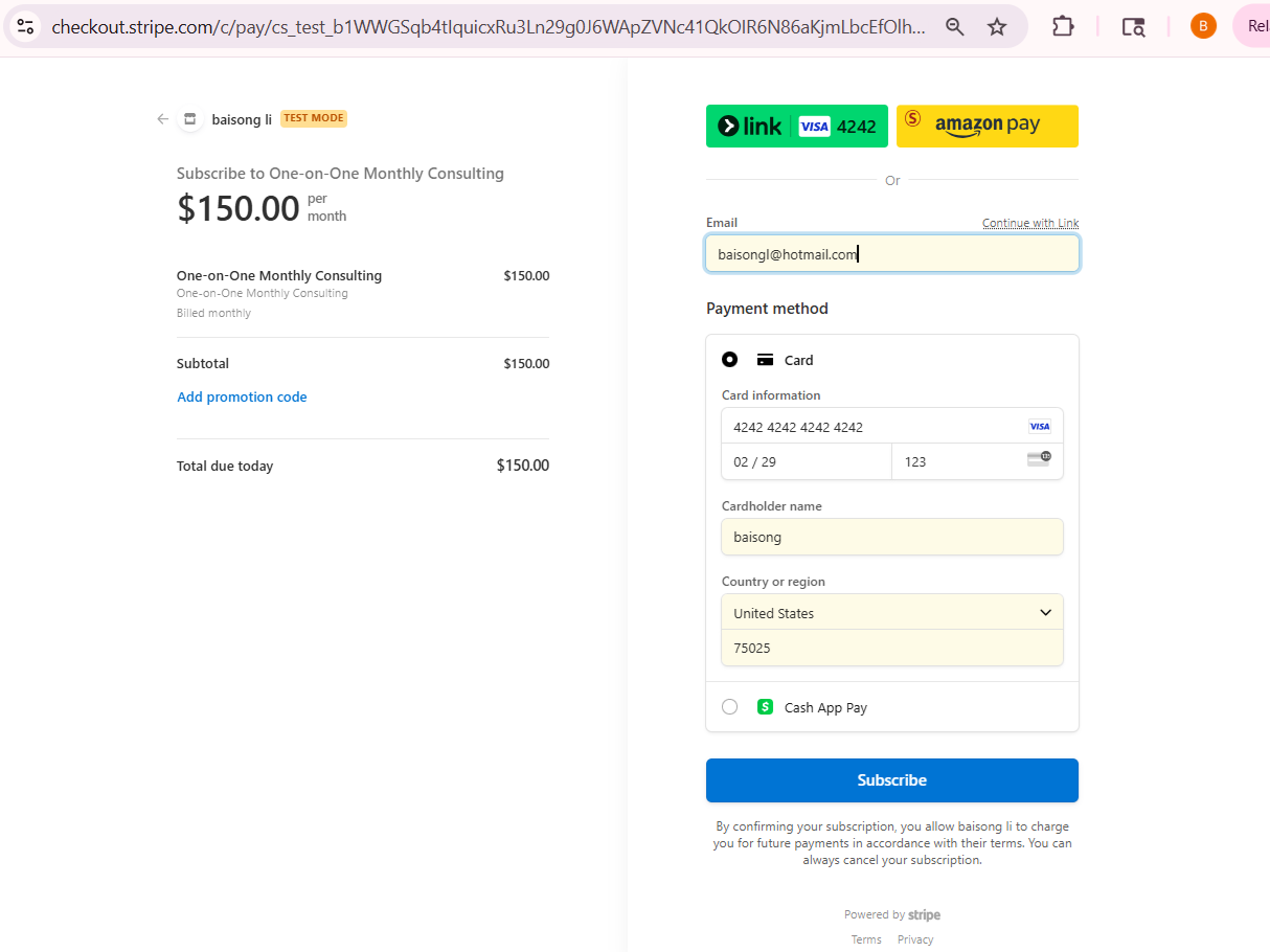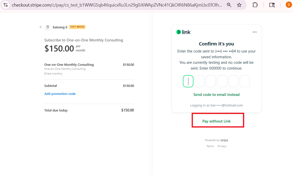 - Step 2: Click the "Subscribe Now" button to be redirected to the Stripe checkout page, choose "Pay without Link"