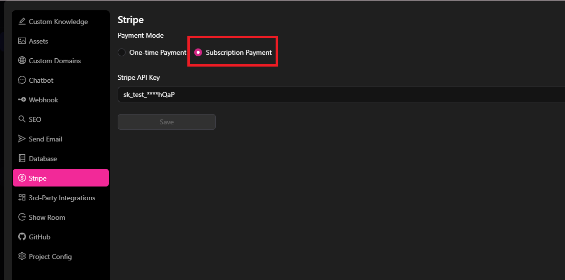 Go to Settings, select Stripe from the left menu, Choose "Subscription Payment" Option, paste your Secret Key into the field, and click "Save".