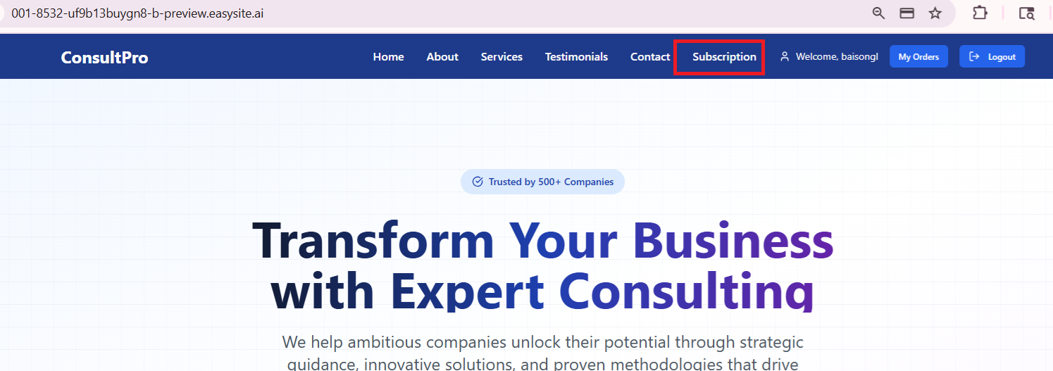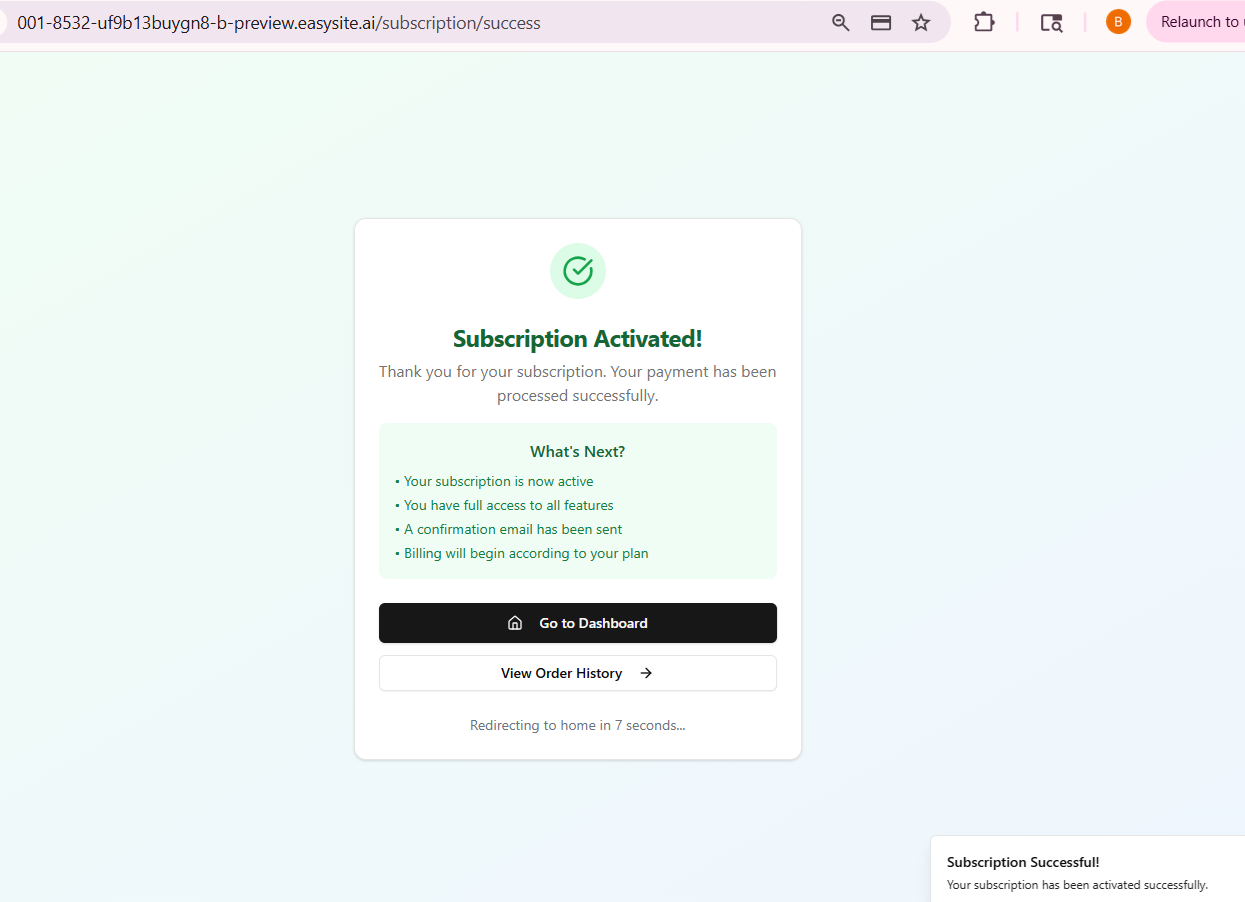 Step 4: After clicking the "Subscribe" button, a payment successful message is displayed.