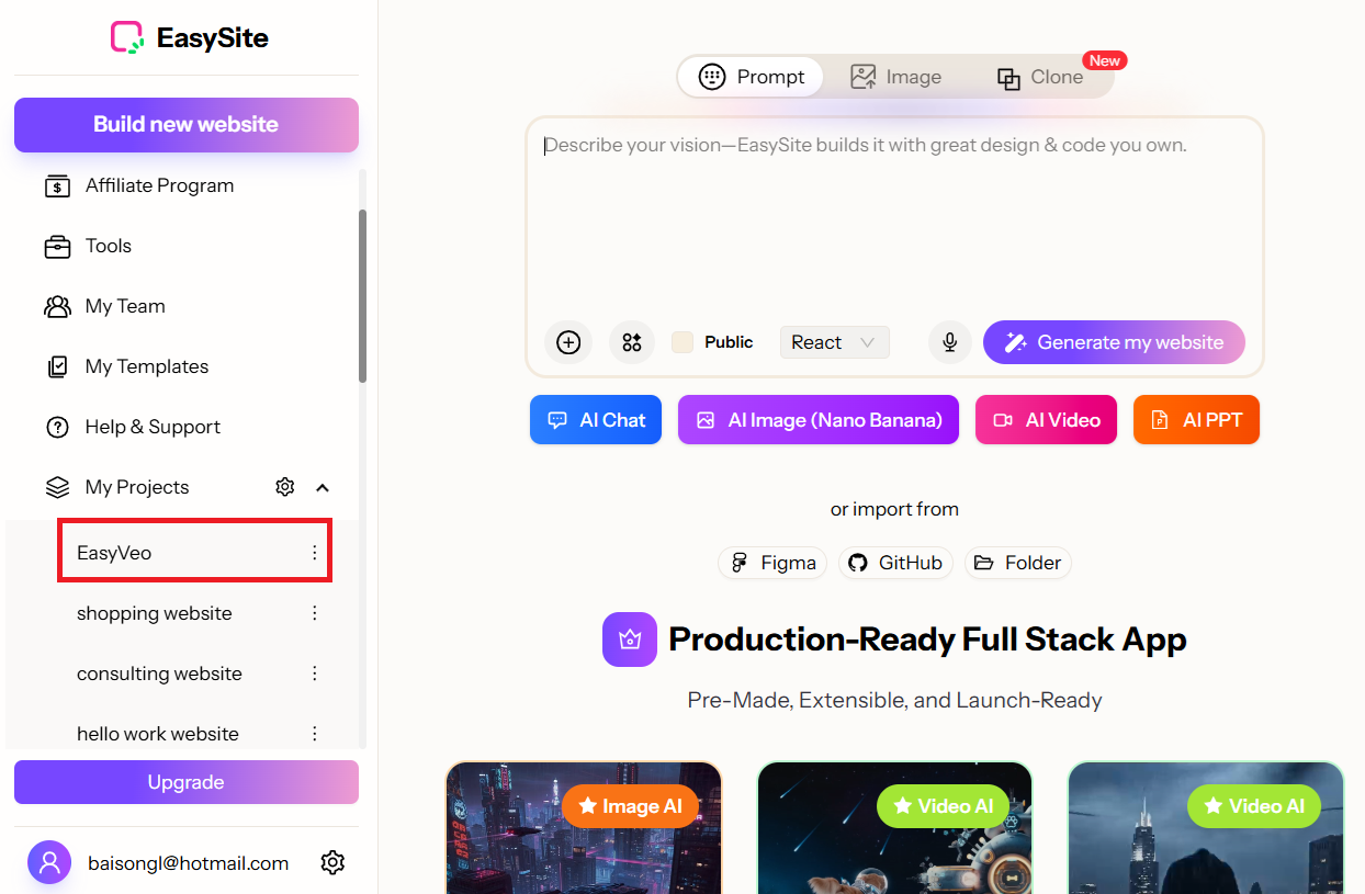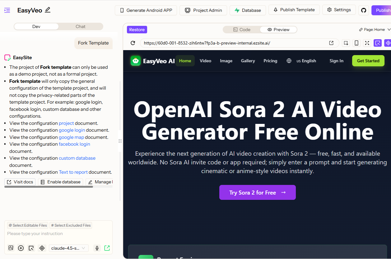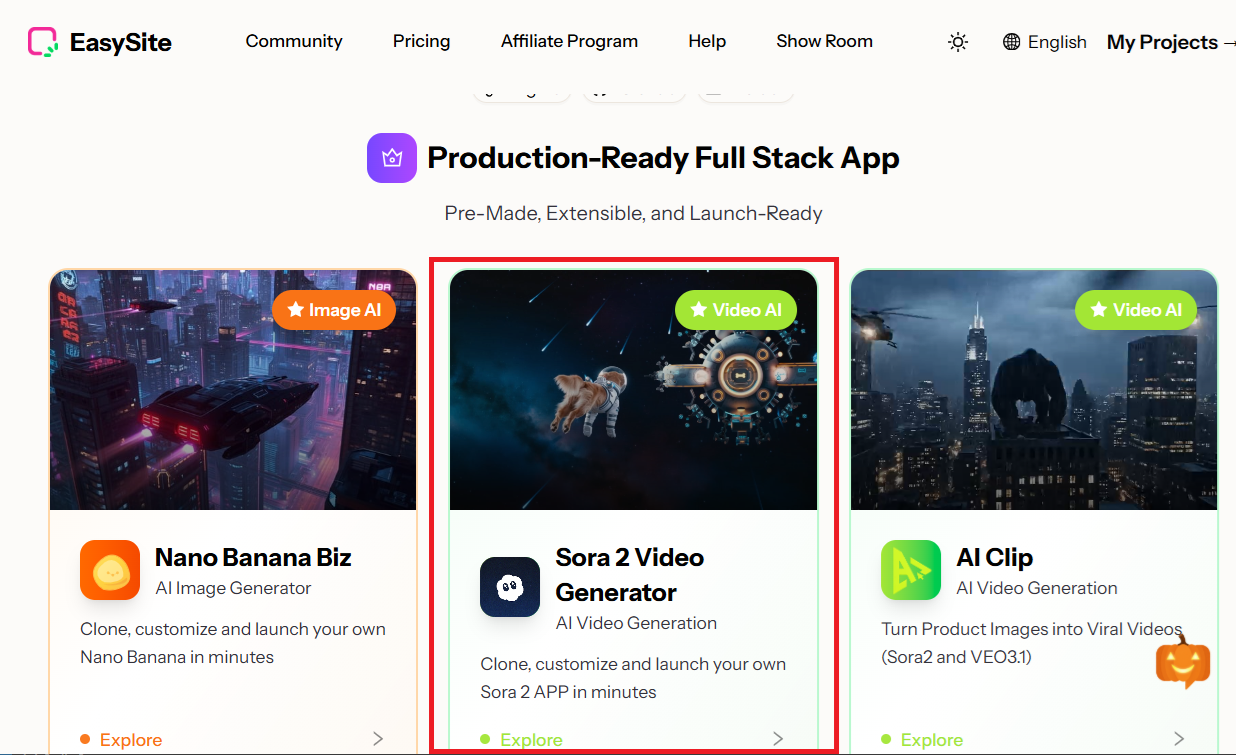 From EZsite homepage, find the Sora 2 Video Generator in the Production Ready Full Stack App section, and click the image.