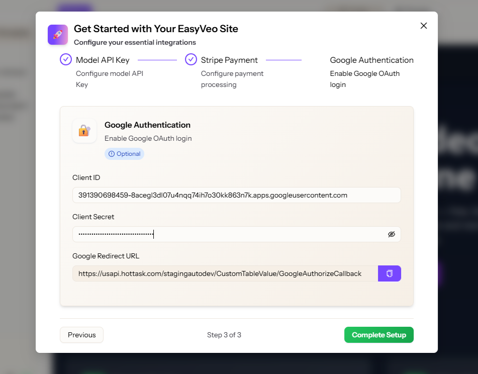 Copy your Google API Client ID and Client Secret, then paste them into the Google Authentication section.