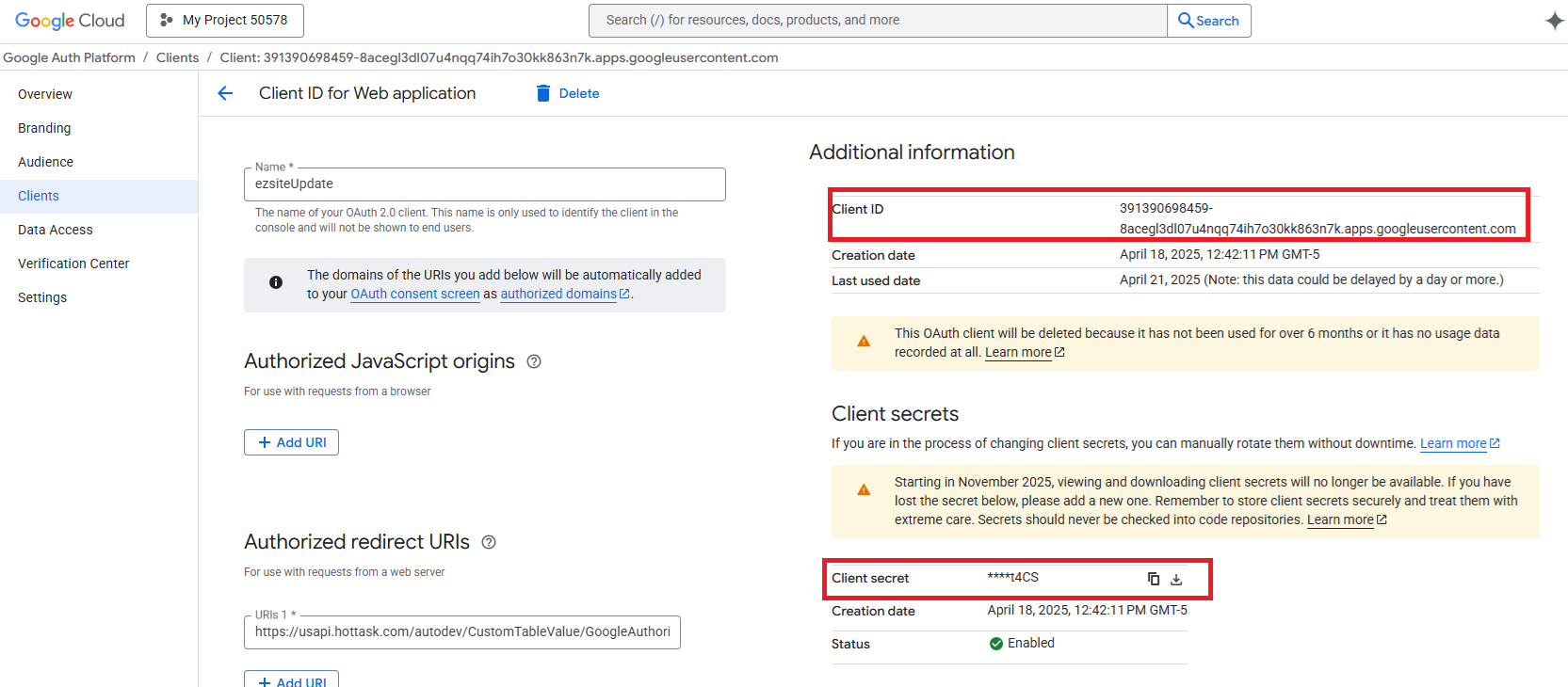 The screenshot below shows how to locate your Google API Client ID and Client Secret.