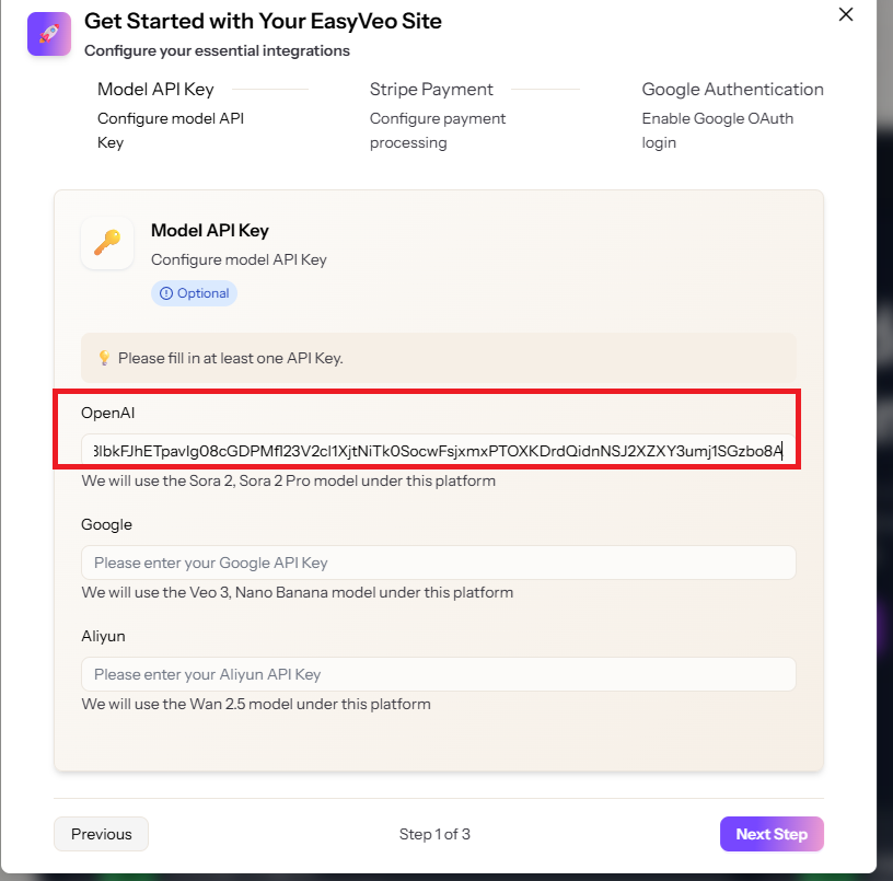In the screenshot below, we use an OpenAI API key as an example. You can find your own API key in your OpenAI account.