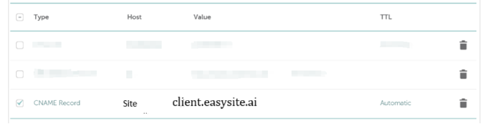 Note: When setting up your CNAME record, please use client.ezsite.ai as the CNAME value. For the Host Name, you can choose any name you prefer, such as "Site".
