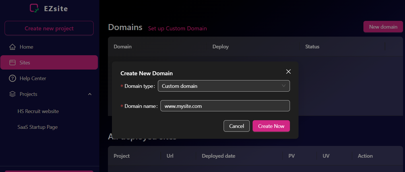With EZsite Pro and Premium plans, you can connect your own domains or set up custom .easysite.host domains for your projects. Follow these steps to add and manage your custom domain: